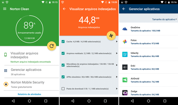 Norton Clean é um aplicativo gratuito para Android que ajuda a recuperar espaço no smartphone detectando e removendo o lixo do smartphone, como cache do sistema e de aplicativos, arquivos residuais, APKs e downloads. Além disso você também pode desinstalar os apps desnecessários.