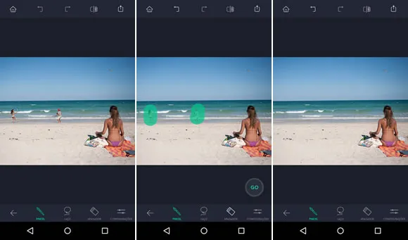 O PixelRetouch é um aplicativo gratuito para Android desenvolvido especificamente para remoção de objetos e pessoas de fotos. Basta você selecionar a opção “remoção de objetos”, usar o pincel ou o laço para selecionar o item que deseja remover da foto e tocar no botão “Go” para removê-lo.