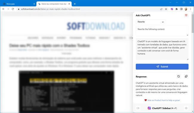 ChatGPT Sidebar é uma extensão para Google Chrome que coloca uma barra lateral no navegador para você usar o ChatGPT. Além disso, ele vem com modelos predefinidos que facilitam o uso. Você pode resumir textos, fazer perguntas, verificar a gramática, traduzir e reescrever textos, entre outros.