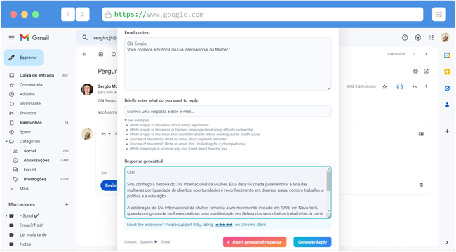 O ChatGPT Writer é uma extensão para o Google Chrome capaz de escrever e-mails e mensagens usando a inteligência artificial do ChatGPT. Ele gera respostas de alta qualidade e funciona bem em todos os sites e se integra ao Gmail adicionando um botão na caixa de resposta de e-mail do Gmail.
