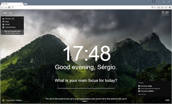 O Momentum é uma extensão para Google Chrome que adiciona várias informações úteis, além de uma bela imagem de plano de fundo diferente todos os dias. Ele exibe o relógio no centro da página, lista de tarefas, previsão do tempo, frase motivadora e uma lista de links rápidos para você acessar.