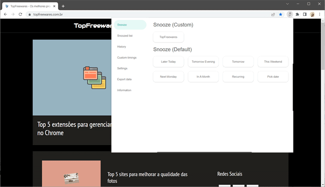 O Snooze Tabby é uma extensão para o Google Chrome que lhe permite agendar guias para serem abertas depois. Diferente do Pocket, o SnoozeTabby reabre as guias automaticamente para você no horário agendado. Isso pode ser útil para reduzir temporariamente o número de guias no navegador.