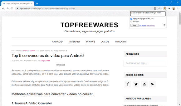 O Page Notes é uma extensão para Google Chrome que lhe permite fazer anotações em páginas da web. Basta clicar no ícone da extensão e adicionar o texto. Duas características interessantes são a opção de sincronizar as anotações com o Google Drive e a opção de criptografar as suas anotações.