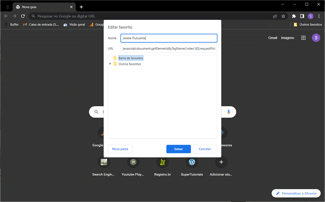 Com um pequeno truque é possível usar esse recurso sem instalar nenhuma extensão. Clique com o botão direito na barra de favoritos, selecione a opção “Adicionar página” e cole o comando abaixo no campo “URL” e quando quiser assistir o vídeo em uma janela flututante, clique no favoritos que criou.