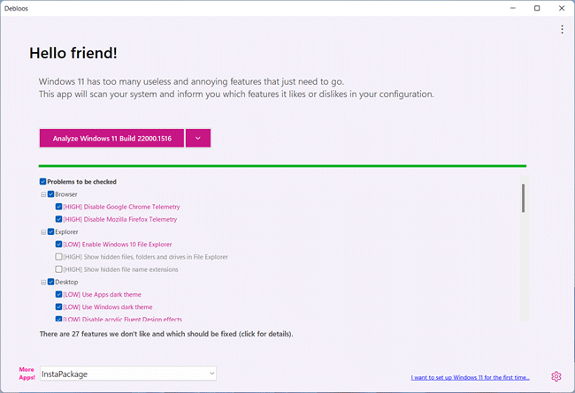 Debloos é um aplicativo gratuito que lhe permite desabilitar e remover recursos desnecessários do Windows 11 para melhorar o desempenho do seu computador. Ao executar o Debloos, ele faz uma análise inicial do sistema e, em seguida, oferece “sugestões de correção” para otimizar o Windows.