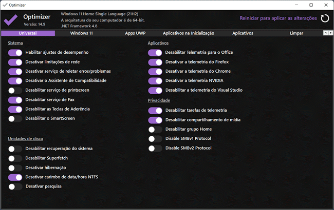 O Optimizer é um programa gratuito disponível para Windows 11, Windows 10 e versões anteriores, que oferece uma grande coleção de ajustes que você pode aplicar com apenas alguns cliques para otimizar o sistema operacional em seu PC e obter o máximo desempenho, privacidade e segurança.