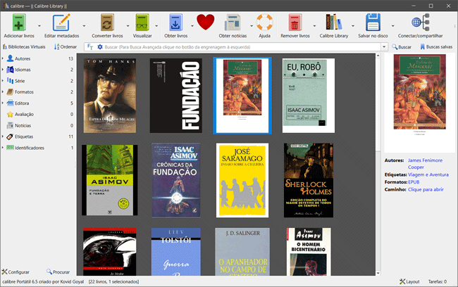 Calibre é um poderoso gerenciador de ebooks gratuito. Ele suporta vários formatos de ebooks como EPUB, LRF, PDF e MOBI, oferece uma maneira fácil de você organizar e ler seus ebooks a partir do computador, baixar ebooks de várias fontes na internet, converter ebooks para outros formatos, etc.