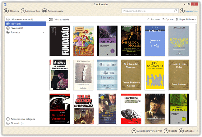O IceCream Ebook Reader é mais uma boa opção para você ler e gerenciar os seus ebooks a partir do seu computador. Ele permite importar ebooks nos formatos EPUB, MOBI, FB2, PDF, CBR e CBZ, permite que você crie e gerencie a sua biblioteca de livros digitais diretamente do seu computador.