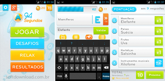 94 Segundos é um jogo gratuito para Android onde o desafio é encontrar palavras iniciadas com uma letra específica fornecida pelo jogo. Ele fornece um assunto, como por exemplo a capital de um país e uma letra, e você tem que descobrir a capital de um país com a letra que foi fornecida.
