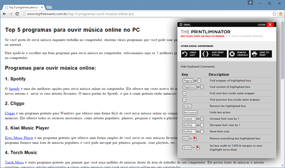 Printliminator é um serviço online que lhe permite remover todos os elementos desnecessários das páginas antes de imprimi-la. Diferente de outras opções, o Printliminator não remove os elementos automaticamente, você tem que selecionar manualmente tudo o que não deseja imprimir na página.