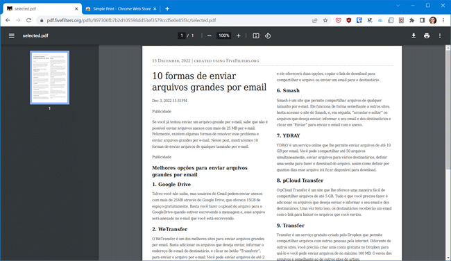 SimplePrint oferece uma solução simples e elegante para imprimir páginas da web. Ele transforma a página em um documento PDF para impressão formatado e sem menu, anúncios, imagens e outros elementos desnecessários. Você pode usar a extensão (Chrome e Firefox) ou usá-lo a partir do site.
