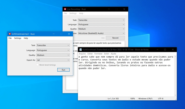 O Buzz é um programa gratuito de transcrição de áudio que permite gerar legendas para vídeos. Ele suporta arquivos de vídeo, então, basta selecionar o arquivo de vídeo que deseja legendar e, ele irá transcrever o áudio para texto e salvá-lo em um arquivo de legenda (.srt), sincronizado com o vídeo.