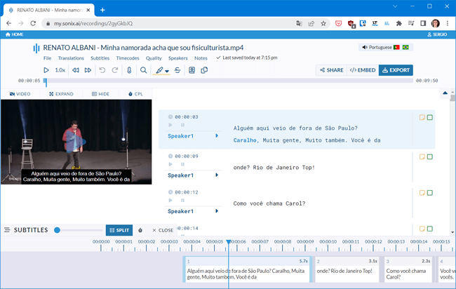 Sonix é um serviço de transcrição de áudio que você pode usar para legendar seus vídeos. Embora ele não seja gratuito, você pode fazer um “teste grátis” com 30 minutos de transcrição. Basta fazer o upload do arquivo de vídeo e. ele irá realizar a transcrição. No final, você pode baixar um arquivo .srt.