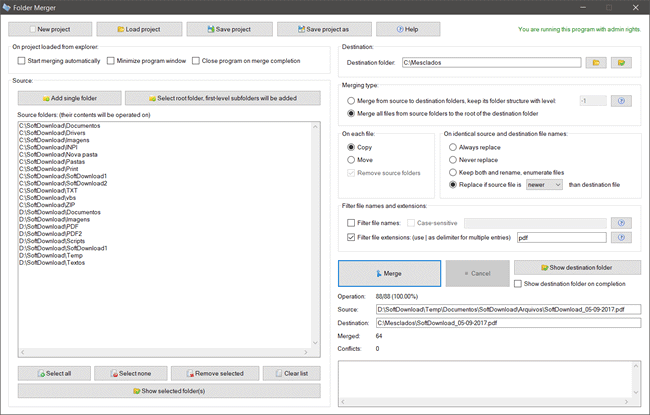 O SmartCopyTool é um programa que permite copiar ou mover arquivos de vários locais de origem para um único local de destino. Portanto, ele também pode ser usado para mesclar duas pastas em uma. Basicamente, basta você selecionar as pastas que desela mesclar e definir a pasta de destino.