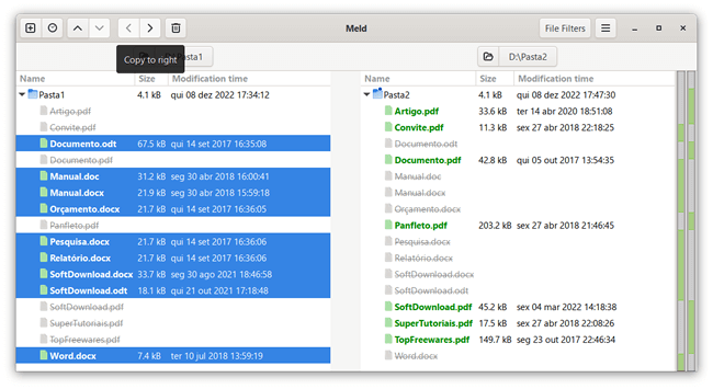 Meld é outro programa gratuito capaz de mesclar arquivos e pastas no computador. Clique no botão “Folder”, adicione as pastas e clique no botão “Compare” para compará-las. Em seguida, marque os arquivos em verde e clique no botão “Copy to right” para mesclar os arquivos das pastas na pasta 2.