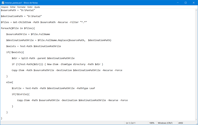 Você também pode usar um script para mesclar pastas no computador. Basta você baixar o script e editá-lo no bloco de notas, escolhendo a pasta de origem (source) e a pasta de destino (destination). Uma vez feito isso, basta executar o script no PowerShell para mesclar o conteúdo das duas pastas.