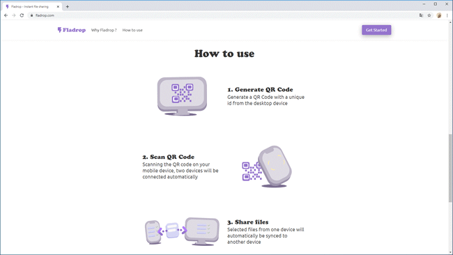 O FlaDrop é um serviço online gratuito que lhe oferece uma forma simples de transferir arquivos do computador para o celular e vice-versa direto do navegador. Ele gera um código QR que você deve digitalizar no telefone para conectar os dispositivos e assim transferir arquivos entre os dispositivos.