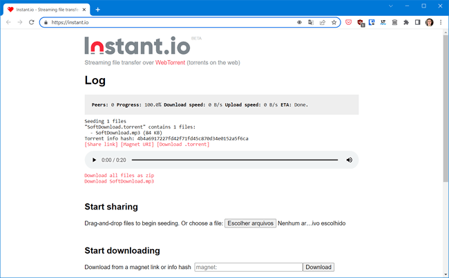 O Instant.io possui um funcionamento semelhante ao FilePizza, ele permite transferir arquivos de um computador para outro através da internet. Basta adicionar o arquivo para ele criar o link de download para baixar o arquivo no segundo dispositivo. O download é feito direto de um dispositivo para outro.