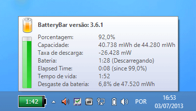 BatteryBar é um programa gratuito que monitora e exibe informações detalhadas sobre a bateria do notebook na barra de tarefas do Windows. A cor do ícone do BatteryBar na barra de tarefas exibe a porcentagem da bateria, verde acima de 35%, amarela entre 20% e 35% e vermelho abaixo de 20%.