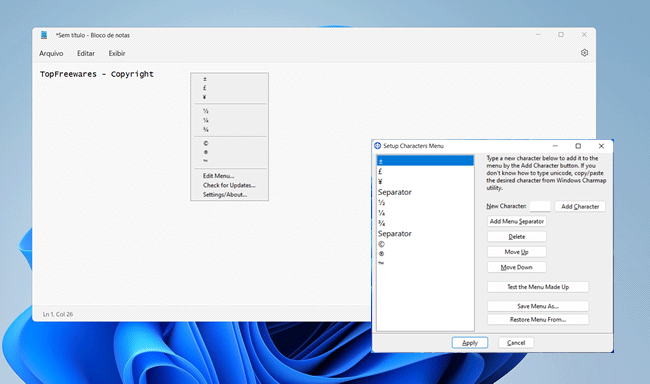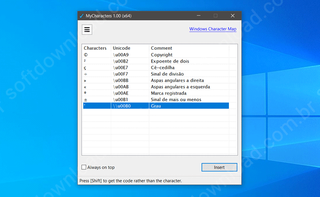O MyCharacters é um programa gratuito com um funcionamento muito interessante para quem utiliza caracteres especiais. Ele permite que você salve caracteres especiais que você usa com frequência, para que você possa reutilizá-los rapidamente sem precisar ficar procurando os caracteres no mapa.