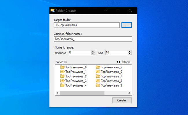 O Folder Creator é mais um programa gratuito para Windows que oferece uma forma rápida de criar múltiplas pastas no computador. Basta você executar o programa, selecionar uma pasta principal e definir um nome padrão, selecionar o número de pastas que deseja criar, e clicar no botão “Create”.