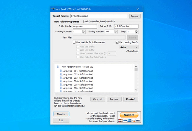 O New Folder Wizard é um programa gratuito para Windows que lhe oferece uma maneira prática e rápida de criar pastas em lote. Basta selecionar o local aonde deseja criar as pastas e definir como as pastas serão nomeadas. Você pode adicionar prefixo, sufixo e a numeração para criar as pastas.