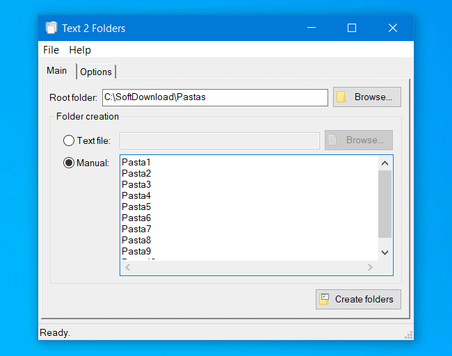 O Text 2 Folders é um programa gratuito para Windows que lhe oferece uma forma simples de criar múltiplas pastas no computador. Ele oferece duas maneiras diferentes de criar pastas em lote, você pode importar um arquivo TXT com os nomes, ou usar a opção manual e inserir o nome das pastas.