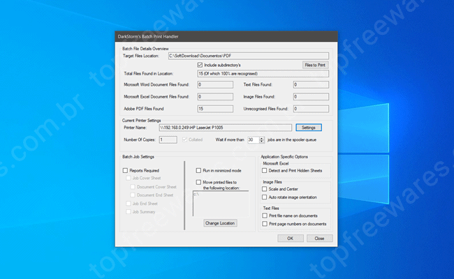 Batch Print Handler é um programa gratuito de impressão de arquivos em lote para Windows capaz de imprimir documentos do Word, Excel, PDF, arquivos de texto e imagem. Basta adicionar a pasta com os arquivos, configurar as opções de impressão e aguardar o programa realizar o seu trabalho.
