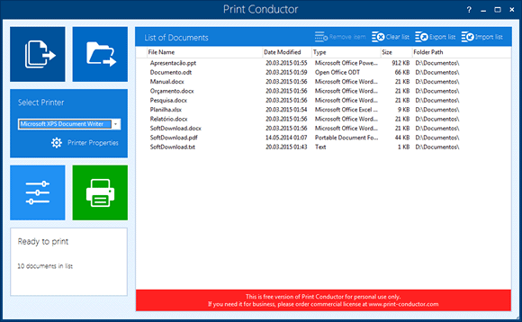 Print Conductor é um excelente programa gratuito para imprimir múltiplos arquivos ao mesmo tempo. Tudo que você precisa fazer é adicionar os documentos que deseja imprimir. Ele suporta mais de 50 tipos de arquivos, como documentos PDF, Microsoft Office, Open Office, AutoCAD, HTML, SVG, etc.