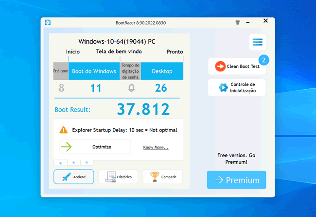 O BootRacer é outro programa capaz de medir o tempo que o seu computador demora para iniciar o Windows. Ele é muito simples de usar, basta instalar o programa, executá-lo e clicar em “Começar”. Uma vez feito isso, ele irá reiniciar o computador e medir o tempo gasto na inicialização do Windows.