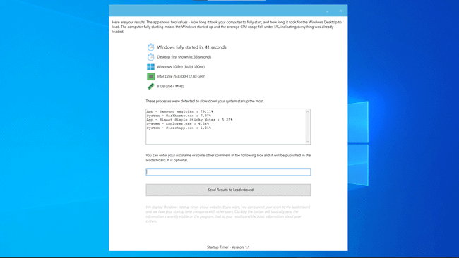 Startup Timer é um pequeno programa gratuito que oferece uma forma simples de medir o tempo de inicialização do computador. Tudo o que você precisa fazer é executar o programa e clicar no botão “Restart Computer” para reiniciar o sistema e começar a medir o tempo de inicialização do Windows.