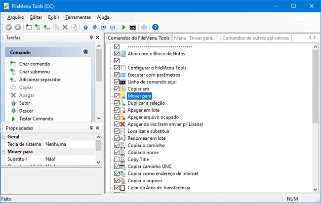 FileMenu Tools é uma ferramenta gratuita para Windows que permite que você gerencie o menu de contexto do Windows Explorer (botão direito). Você pode adicionar diversos comandos, como excluir definitivamente, mover para, copiar o nome e o caminho, renomear em lote, localizar e substituir, etc.