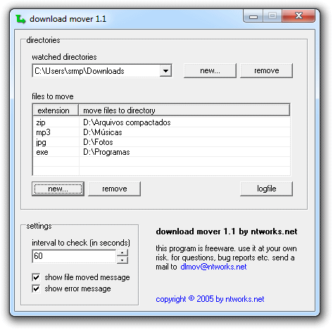 Diferente do DropIt, o Download Mover é um programa bem simples de usar. Ele permite que você organize os arquivos da sua pasta de downloads por formato, criando subdiretórios para cada tipo de arquivo. Ele monitora a pasta de downloads e organiza os arquivos automaticamente pra você.