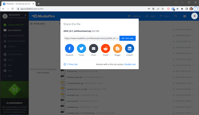 Assim como o Zippyshare, o Mediafire é uma boa opção para compartilhar arquivos que você deseja compartilhar com muitas pessoas. O Mediafire oferece 10 GB de armazenamento gratuito e limite de tamanho de arquivo de 4 GB. Diferente do Zippyshare, os arquivos não são removidos após 30 dias.
