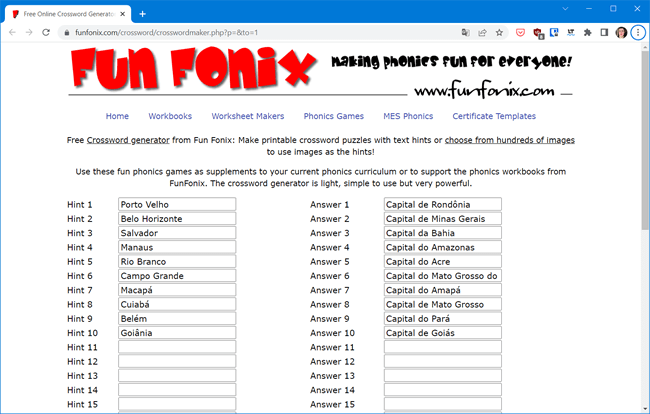 O Funfonix é mais um site que permite que você crie palavras cruzadas para impressão. Embora ele esteja em inglês, seu funcionamento é muito simples, basta cadastrar as dicas e as palavras e clicar no botão “Get crossword” para gerar uma palavra cruzada e depois, clique em “Print” para imprimi-la.