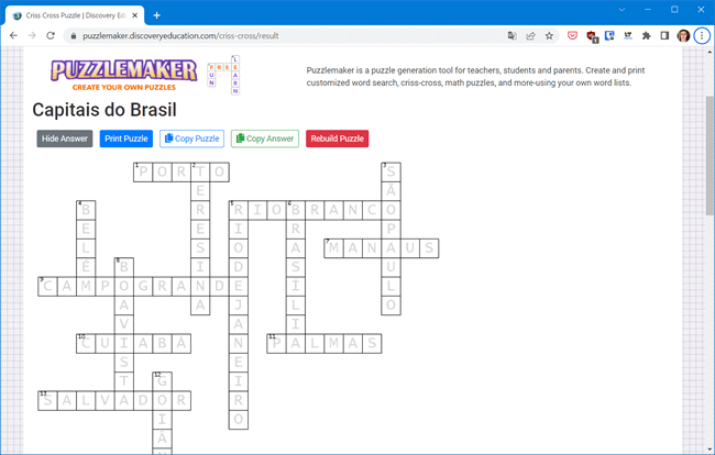 PuzzleMaker é um site que você pode usar para criar palavras cruzadas. Basta você adicionar uma palavra e dica por linha separadas por um espaço e clicar no botão “Create my puzzle” para criar a palavra cruzada que você pode imprimir, copiar e recriar, se não gostar da distribuição das palavras.
