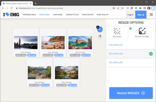 O iLoveIMG é um site que oferece uma forma fácil de redimensionar imagens em massa. Basta você adicionar as imagens, ele suporta JPG, PNG, SVG e GIF, definir as novas dimensões usando “pixel” para redimensionar a imagem para um tamanho exato ou porcentagem e clicar em “Resize Images”.