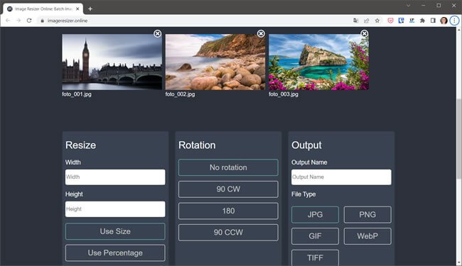 Image Resizer Online é outro site que você pode usar para redimensionar imagens online em massa, sem precisar instalar nada no computador. Basta adicionar as imagens, ele suporta JPG, PNG, GIF, TIFF e WebP, escolher o modo de redimensionamento (pixels ou porcentagem) e clicar em “Resize”.