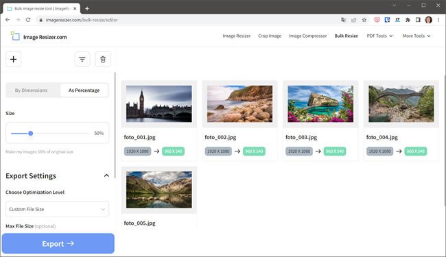 ImageResizer é um site que oferece uma forma simples e rápida de você redimensionar imagens em lote. Você pode redimensionar as imagens especificando as dimensões exatas ou redimensioná-las definindo uma porcentagem da imagem original. Ele é capaz de redimensionar imagens JPG e PNG.