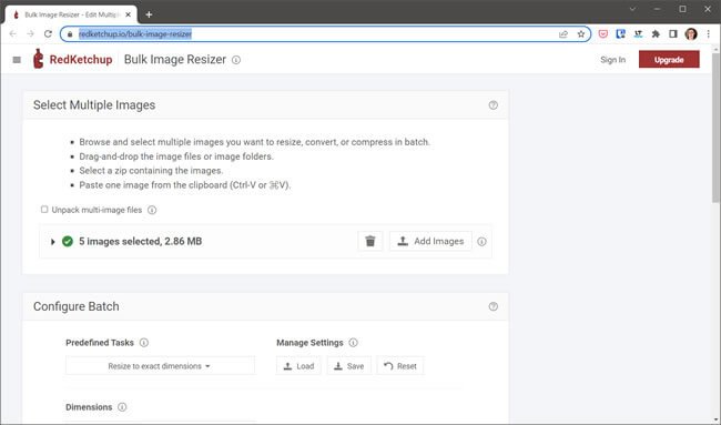O RedKetchup Bulk Image Resizer é mais um site que você pode usar para redimensionar imagens em lote no navegador. Para usá-lo, adicione as imagens (PNG, JPG, BMP, WEBP, etc) e selecione uma opção, como a “Resize for exact dimensions”, defina as dimensões e clique em “Proces batch”.