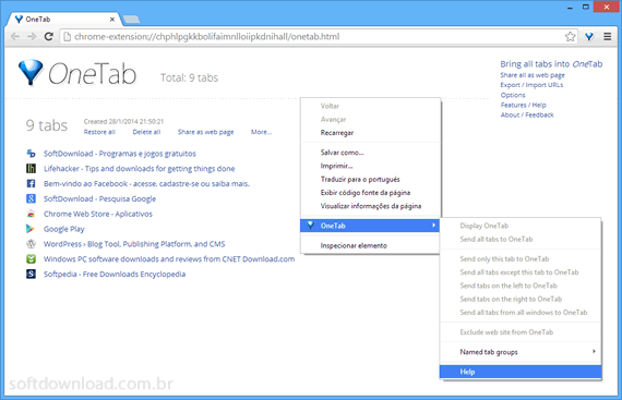 OneTab é uma extensão para o Google Chrome que agrupa todas as guias abertas no navegador em uma lista. Com isso, você libera espaço no navegador, localiza mais rapidamente as guias em que está trabalhando e ainda reduz significativamente o consumo de memória do Google Chrome.
