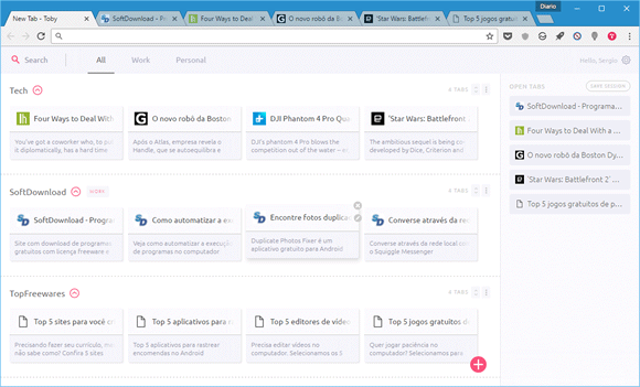 Toby é uma extensão para o Google Chrome que ajuda você a organizar as guias abertas e reduzir o consumo de memória do navegador. Você pode organizar as guias em grupos manualmente ou então usar a opção “Save Session” para salvar todas as guias abertas no navegador em uma lista.