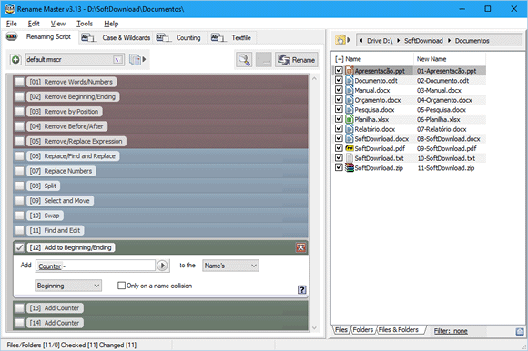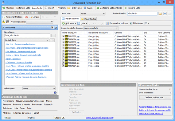 O ReNamer é um programa gratuito que lhe permite renomear múltiplos arquivos com apenas um clique. Ele é mais simples de usar e permite que você crie regras para adicionar prefixos e sufixos, fazer substituições, incluir e remover, usar letras maiúsculas e minúsculas, inserir numeração, etc.
