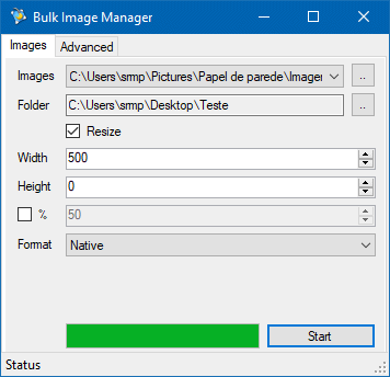 Bulk Image Manager é mais um programa gratuito para Windows que lhe permitirá redimensionar imagens em lote de uma maneira simples e rápida. Basta você selecionar as imagens que deseja redimensionar, definir as dimensões das novas imagens e clicar em “Start” para redimensioná-las.